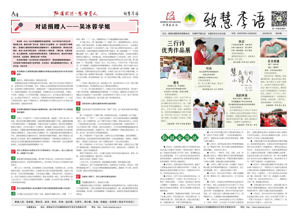 由弘慧学子联合会主导设计的《致慧季语》送到了初高中弘慧学弟学妹手中,他们正在阅读和了解学长学姐故事、风采,感受学长学姐们传递的青春、能量、活力、爱与希望……我们期待通过《致慧季语》来推动弘慧大学生和初高中生的联系与融合,彼此陪伴、共同成长。